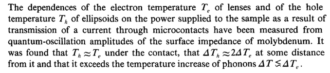 The dependences of the electron temperature Te of lenses and of the hole temperature Th of ellipsoids on the power supplied to the sample as a result of transmission of a current through microcontacts have been measured from quantum-oscillation amplitudes of the surface impedance of molybdenum. It was found that Th ~Te under the contact, that ATh ~2ATe at some distance from it and that it exceeds the temperature increase of phonons ATSATe.