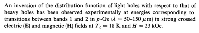 An inversion of the distribution function of light holes with respect to that of heavy holes has been observed experimentally at energies corresponding to transitions between bands 1 and 2 in p~Ge (A = 50-150 μιη) in strong crossed electric (E) and magnetic (H) fields at T0 = 18 К and Η = 23 kOe.
