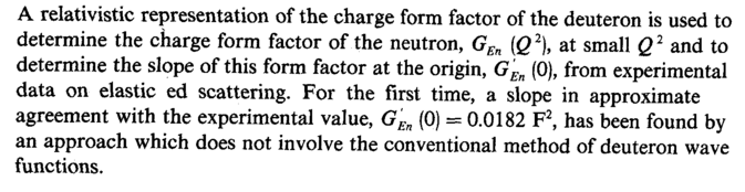 A relativistic representation of the charge form factor of the deuteron is used to determine the charge form factor of the neutron, GEn (Q2), at small Q2 and to determine the slope of this form factor at the origin, GE„ (0), from experimental data on elastic ed scattering. For the first time, a slope in approximate agreement with the experimental value, GEn (0) = 0.0182 F2, has been found by an approach which does not involve the conventional method of deuteron wave functions.