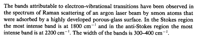 The bands attributable to electron-vibrational transitions have been observed in the spectrum of Raman scattering of an argon laser beam by xenon atoms that were adsorbed by a highly developed porous-glass surface. In the Stokes region the most intense band is at 1800 cm-1 and in the anti-Stokes region the most intense band is at 2200 cm-1. The width of the bands is 300-400 cm"1.