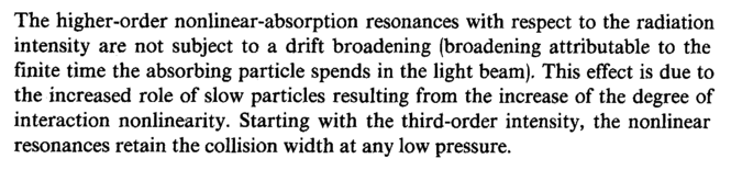 The higher-order nonlinear-absorption resonances with respect to the radiation intensity are not subject to a drift broadening (broadening attributable to the finite time the absorbing particle spends in the light beam). This effect is due to the increased role of slow particles resulting from the increase of the degree of interaction nonlinearity. Starting with the third-order intensity, the nonlinear resonances retain the collision width at any low pressure.