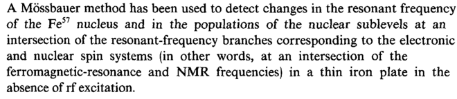 A Mossbauer method has been used to detect changes in the resonant frequency of the Fe57 nucleus and in the populations of the nuclear sublevels at an intersection of the resonant-frequency branches corresponding to the electronic and nuclear spin systems (in other words, at an intersection of the ferromagnetic-resonance and NMR frequencies) in a thin iron plate in the absence of rf excitation.