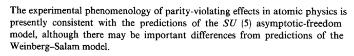The experimental phenomenology of parity-violating effects in atomic physics is presently consistent with the predictions of the SU (5) asymptotic-freedom model, although there may be important differences from predictions of the Weinberg-Salam model.