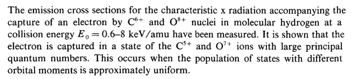 The emission cross sections for the characteristic χ radiation accompanying the capture of an electron by C6+ and Os+ nuclei in molecular hydrogen at a collision energy EQ = 0.6-8 keV/amu have been measured. It is shown that the electron is captured in a state of the C5+ and 07+ ions with large principal quantum numbers. This occurs when the population of states with different orbital moments is approximately uniform.