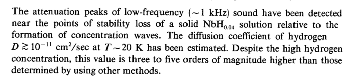 The attenuation peaks of low-frequency (~ 1 kHz) sound have been detected near the points of stability loss of a solid NbH0 04 solution relative to the formation of concentration waves. The diffusion coefficient of hydrogen D £ 10"11 cmVsec at Г~20 К has been estimated. Despite the high hydrogen concentration, this value is three to five orders of magnitude higher than those determined by using other methods.