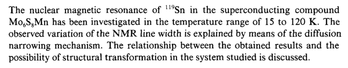 The nuclear magnetic resonance of I19Sn in the superconducting compound Mo6S8Mn has been investigated in the temperature range of 15 to 120 K. The observed variation of the NMR line width is explained by means of the diffusion narrowing mechanism. The relationship between the obtained results and the possibility of structural transformation in the system studied is discussed.