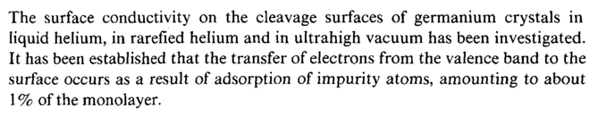 The surface conductivity on the cleavage surfaces of germanium crystals in liquid helium, in rarefied helium and in ultrahigh vacuum has been investigated. It has been established that the transfer of electrons from the valence band to the surface occurs as a result of adsorption of impurity atoms, amounting to about 1 % of the monolayer.