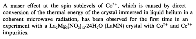A maser effect at the spin sublevels of Co2+, which is caused by direct conversion of the thermal energy of the crystal immersed in liquid helium in a coherent microwave radiation, has been observed for the first time in an experiment with a La2Mg3(N03)12.24H20 (LaMN) crystal with Co2+ and Ce3+ impurities.