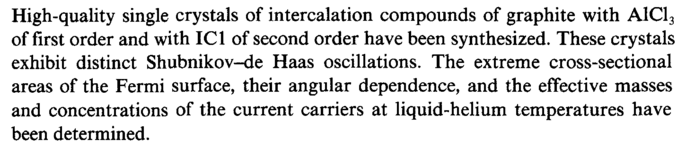 High-quality single crystals of intercalation compounds of graphite with A1C13 of first order and with IC1 of second order have been synthesized. These crystals exhibit distinct Shubnikov-de Haas oscillations. The extreme cross-sectional areas of the Fermi surface, their angular dependence, and the effective masses and concentrations of the current carriers at liquid-helium temperatures have been determined.