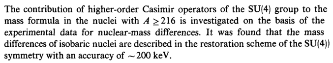 The contribution of higher-order Casimir operators of the SU(4) group to the mass formula in the nuclei with A > 216 is investigated on the basis of the experimental data for nuclear-mass differences. It was found that the mass differences of isobaric nuclei are described in the restoration scheme of the SU(4)) symmetry with an accuracy of ~ 200 keV.
