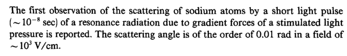 The first observation of the scattering of sodium atoms by a short light pulse (~ 10"8 sec) of a resonance radiation due to gradient forces of a stimulated light pressure is reported. The scattering angle is of the order of 0.01 rad in a field of ~ 103 V/cm.