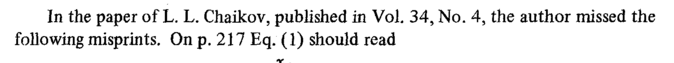 In the paper of L. L. Chaikov, published in Vol, 34, No. 4, the author missed the following misprints. On p. 217 Eq. (1) should read
