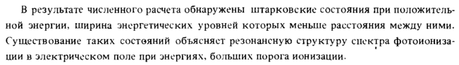 В результате численного расчета обнаружены штарковские состояния при положительной энергии, ширина энергетических уровней которых меньше расстояния между ними. Существование таких состояний объясняет резонансную структуру спектра фотоиониза-ции в электрическом поле при энергиях, больших порога ионизации.