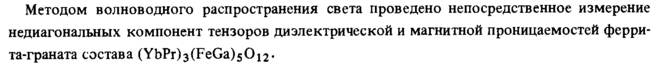 Методом волноводного распространения света проведено непосредственное измерение недиагональных компонент тензоров диэлектрической и магнитной проницаемостей феррита-граната состава (YbPr)3(FeGa)5 0i2«