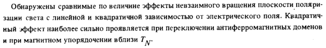 Обнаружены сравнимые по величине эффекты невзаимного вращения плоскости поляризации света с линейной и квадратичной зависимостью от электрического поля. Квадратичный эффект наиболее сильно проявляется при переключении антиферромагнитных доменов и при магнитном упорядочении вблизи Т^.
