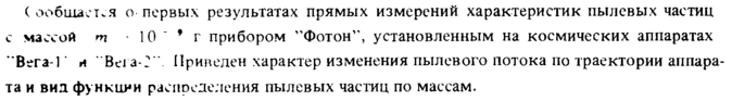 С ообшаси'Я опервых результатах прямых измерений характеристик пылевых частиц с массой т 10 ' * г прибором "Фотон", установленным на космических аппаратах "Вега-1 * и "Вега-Г". Приведен характер изменения пылевого потока по траектории аппарата и вид функции распределения пылевых частиц по массам.