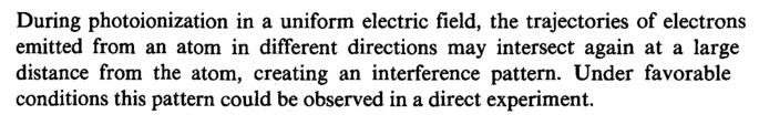 During photoionization in a uniform electric field, the trajectories of electrons emitted from an atom in different directions may intersect again at a large distance from the atom, creating an interference pattern. Under favorable conditions this pattern could be observed in a direct experiment.