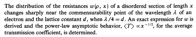 The distribution of the resistances w {ρ, χ) of a disordered section of length χ changes sharply near the commensurability point of the wavelength λ of an electron and the lattice constant </, when Λ/4 = d. An exact expression for w is derived and the power-law asymptotic behavior, <Г> czx~l/2, for the average transmission coefficient, is determined.