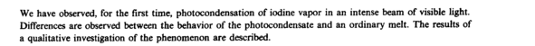 We have observed, for the first time, photocondensation of iodine vapor in an intense beam of visible light. Differences are observed between the behavior of the photocondensate and an ordinary melt. The results of a qualitative investigation of the phenomenon are described.