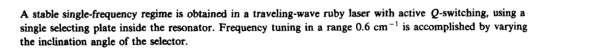 A stable single-frequency regime is obtained in a traveling-wave ruby laser with active Q-switching, using a single selecting plate inside the resonator. Frequency tuning in a range 0.6 cm-1 is accomplished by varying the inclination angle of the selector.