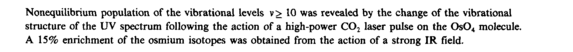 Nonequilibrium population of the vibrational levels v> 10 was revealed by the change of the vibrational structure of the UV spectrum following the action of a high-power C02 laser pulse on the Os04 molecule. A 15% enrichment of the osmium isotopes was obtained from the action of a strong IR field.
