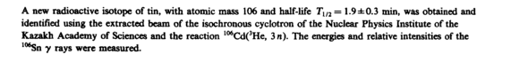 A new radioactive isotope of tin, with atomic mass 106 and half-life Тш = 1.9 ±0.3 min, was obtained and identified using the extracted beam of the isochronous cyclotron of the Nuclear Physics Institute of the Kazakh Academy of Sciences and the reaction 106Cd(3He, 3 n). The energies and relative intensities of the 106Sn γ rays were measured.