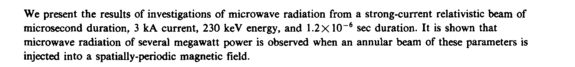 We present the results of investigations of microwave radiation from a strong-current relativistic beam of microsecond duration, 3 kA current, 230 keV energy, and 1.2χ 10-6 sec duration. It is shown that microwave radiation of several megawatt power is observed when an annular beam of these parameters is injected into a spatially-periodic magnetic field.