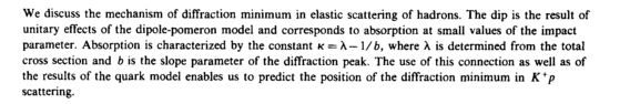 We discuss the mechanism of diffraction minimum in elastic scattering of hadrons. The dip is the result of unitary effects of the dipole-pomeron model and corresponds to absorption at small values of the impact parameter. Absorption is characterized by the constant κ = λ—1/6, where λ is determined from the total cross section and b is the slope parameter of the diffraction peak. The use of this connection as well as of the results of the quark model enables us to predict the position of the diffraction minimum in K+p scattering.