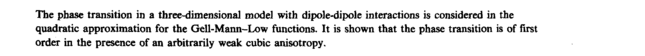 The phase transition in a three-dimensional model with dipole-dipole interactions is considered in the quadratic approximation for the Gell-Mann-Low functions. It is shown that the phase transition is of first order in the presence of an arbitrarily weak cubic anisotropy.