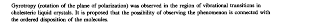 Gyrotropy (rotation of the plane of polarization) was observed in the region of vibrational transitions in cholesteric liquid crystals. It is proposed that the possibility of observing the phenomenon is connected with the ordered disposition of the molecules.