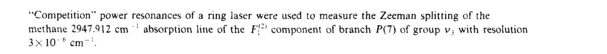 "Competition1' power resonances of a ring laser were used to measure the Zeeman splitting of the methane 2947.912 cm absorption line of the Fp' component of branch P(7) of group v3 with resolution 3X10"6 cm-'.