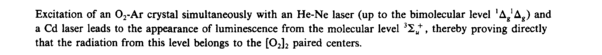 Excitation of an 02-Ar crystal simultaneously with an He-Ne laser (up to the bimolecular level 'Δ^Δ^ and a Cd laser leads to the appearance of luminescence from the molecular level 3Σ +, thereby proving directly that the radiation from this level belongs to the [02]2 paired centers.