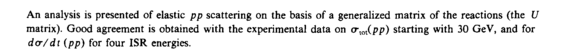 An analysis is presented of elastic ρ ρ scattering on the basis of a generalized matrix of the reactions (the U matrix). Good agreement is obtained with the experimental data on o-tot(pp) starting with 30 GeV, and for άσ/dt {pp) for four ISR energies.