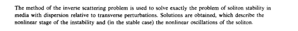 The method of the inverse scattering problem is used to solve exactly the problem of soliton stability in media with dispersion relative to transverse perturbations. Solutions are obtained, which describe the nonlinear stage of the instability and (in the stable case) the nonlinear oscillations of the soliton.