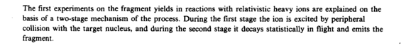 The first experiments on the fragment yields in reactions with relativistic heavy ions are explained on the basis of a two-stage mechanism of the process. During the first stage the ion is excited by peripheral collision with the target nucleus, and during the second stage it decays statistically in flight and emits the fragment.