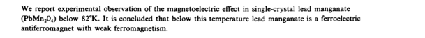 We report experimental observation of the magnetoelectric effect in single-crystal lead manganate (PbMn204) below 82°K. It is concluded that below this temperature lead manganate is a ferroelectric antiferromagnet with weak ferromagnetism.