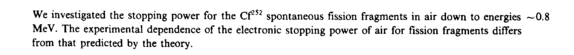We investigated the stopping power for the Cf252 spontaneous fission fragments in air down to energies —0.8 MeV. The experimental dependence of the electronic stopping power of air for fission fragments differs from that predicted by the theory.