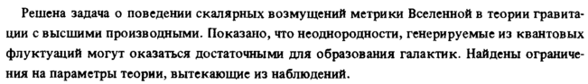 Решена задача о поведении скалярных возмущений метрики Вселенной в теории гравитации с высшими производными. Показано, что неоднородности, генерируемые из квантовых флуктуаций могут оказаться достаточными для образования галактик. Найдены ограничения на параметры теории, вытекающие из наблюдений.