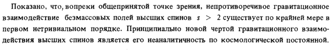 Показано, что, вопреки общепринятой точке зрения, непротиворечивое гравитационное взаимодействие безмассовых полей высших спинов s > 2 существует по крайней мере в первом нетривиальном порядке. Принципиально новой чертой гравитационного взаимодействия высших спинов является его неаналитичность по космологической постоянной.