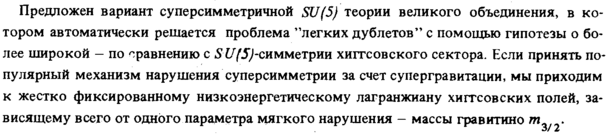 Предложен вариант суперсимметричной SU(5) теории великого объединения, в котором автоматически решается проблема "легких дублетов" с помощью гипотезы о более широкой — по сравнению с S U(5)-симметрии хигтсовского сектора. Если принять популярный механизм нарушения суперсимметрии за счет супергравитации, мы приходим к жестко фиксированному низкоэнергетическому лагранжиану хигтсовских полей, зависящему всего от одного параметра мягкого нарушения массы гравитино т .