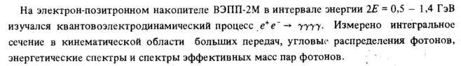 На электрон-позитронном накопителе ВЭПП-2М в интервале энергии 2Е = 0,5 1,4 ГэВ изучался квантовоэлектродинамический процесс е+ е~ -» 7777· Измерено интегральное сечение в кинематической области больших передач, угловые распределения фотонов, энергетические спектры и спектры эффективных масс пар фотонов. ■