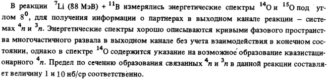 В реакции 7Li (88 МэВ) + ИВ измерялись энергетические спектры !4Ои 150 под углом 8°, для получения информации о партнерах в выходном канале реакции систе- 4 3 мах η и п. Энергетические спектры хорошо описываются кривыми фазового пространства многочастичного развала в выходном канале без учета взаимодействия в конечном сос- 14 тоянии, однако в спектре О содержится указание на возможное образование квазистаци- 4 τύ 4 3 онарного п. Предел по сечению образования связанных ли η в данной реакции составляет величину 1 и 10 нб/ср соответственно.