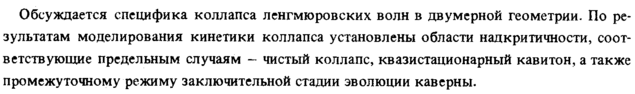 Обсуждается специфика коллапса ленгмюровских волн в двумерной геометрии. По результатам моделирования кинетики коллапса установлены области надкритичности, соответствующие предельным случаям чистый коллапс, квазистационарный кавитон, а также промежуточному режиму заключительной стадии эволюции каверны.