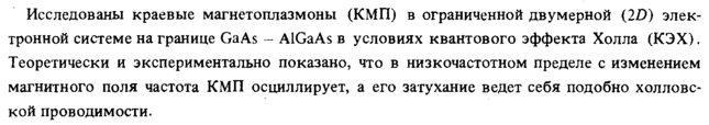 Исследованы краевые магнетоплазмоны (КМП) в ограниченной двумерной (2D) электронной системе на границе GaAs AlGaAs в условиях квантового эффекта Холла (КЭХ). Теоретически и экспериментально показано, что в низкочастотном пределе с изменением магнитного поля частота КМП осциллирует, а его затухание ведет себя подобно холловс-кой проводимости.