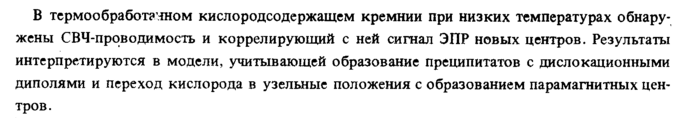 В термо обработанном кислородсодержащем кремнии при низких температурах обнаружены СВЧ-проводимость и коррелирующий с ней сигнал ЭПР новых центров. Результаты интерпретируются в модели, учитывающей образование преципитатов с дислокационными диполями и переход кислорода в узельные положения с образованием парамагнитных центров.