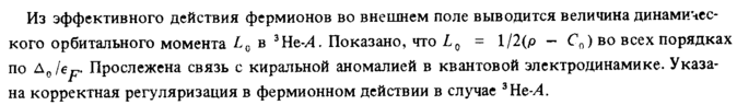 Из эффективного действия фермионов во внешнем поле выводится величина динамического орбитального момента LG в 3Не-Л. Показано, что 10 = Х/2(р С0) во всех порядках по Δ0/6ρ. Прослежена связь с киральной аномалией в квантовой электродинамике. Указана корректная регуляризация в фермионном действии в случае 3Нс-А.