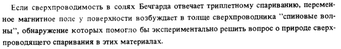 Если сверхпроводимость в солях Бечгарда отвечает триплетному спариванию, переменное магнитное поле у поверхности возбуждает в толще сверхпроводника "спиновые волны", обнаружение которых помогло бы экспериментально решить вопрос о природе сверхпроводящего спаривания в этих материалах.