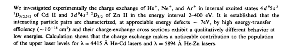 We investigated experimentally the charge exchange of He+, Ne+, and Ar + in internal excited states 4rf95s2 20з/2,5/2 of Cd II and 3d94s2 2D3n of Zn II in the energy interval 2-400 eV. It is established that the interacting particle pairs are characterized, at appreciable energy defects ~ 7eV, by high energy-transfer efficiency (~ 10~16 cm2) and their charge-exchange cross sections exhibit a qualitatively different behavior at low energies. Calculation shows that the charge exchange makes a noticeable contribution to the population of the upper laser levels for λ = 4415 A He-Cd lasers and λ = 5894 A He-Zn lasers.