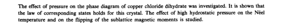 The effect of pressure on the phase diagram of copper chloride dihydrate was investigated. It is shown that the law of corresponding states holds for this crystal. The effect of high hydrostatic pressure on the Neel temperature and on the flipping of the sublattice magnetic moments is studied.
