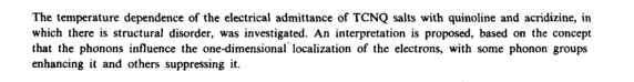 The temperature dependence of the electrical admittance of TCNQ salts with quinoline and acridizine, in which there is structural disorder, was investigated. An interpretation is proposed, based on the concept that the phonons influence the one-dimensional localization of the electrons, with some phonon groups enhancing it and others suppressing it.